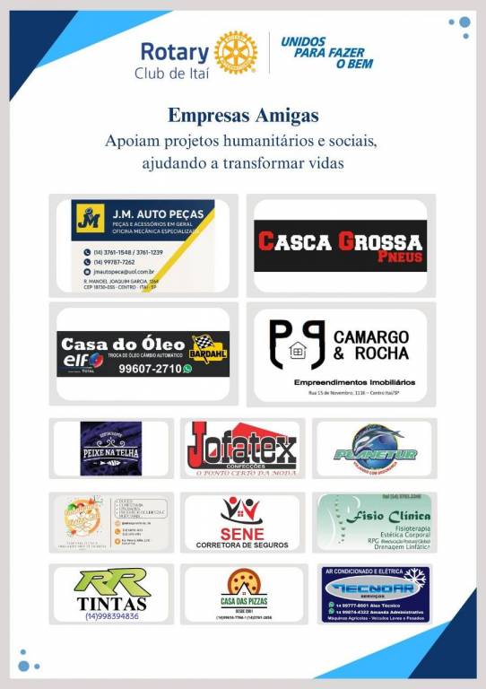 O Rotary Club de Itaí tem a alegria de apresentar as Empresas Amigas do ano rotário 2025/2026 — empresas que se somam à nossa causa e caminham conosco na missão de fazer o bem e transformar vidas.