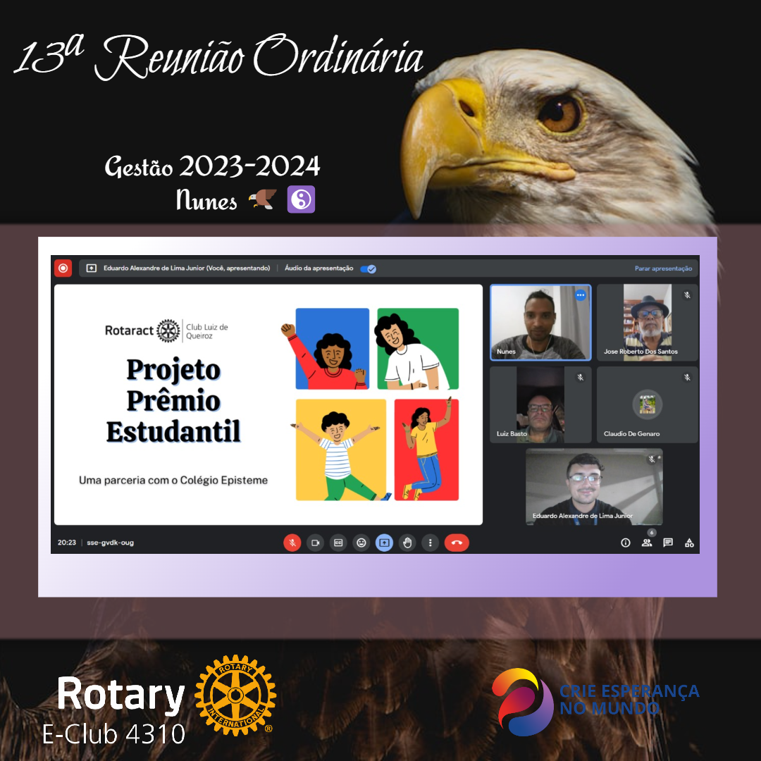 13ª Reunião Ordinária da Gestão 2023-2024 do Rotary E-Club 4310, realizada no dia 19 de Outubro de 2023, sob a presidência do Nunes. Contamos com a presença do Vice Presidente do Rotaract Club Luiz de Queiroz, Eduardo Alexandre. Foco da Reunião: Projeto Prêmio Estudantil, Visita do Governador e Atualização de projetos.