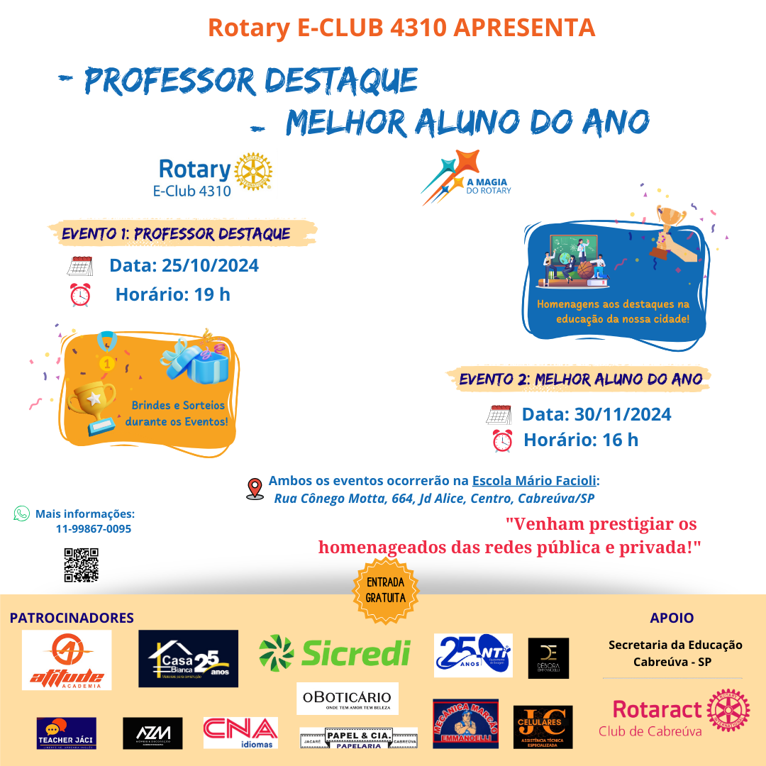 O Rotary E-Club 4310 tem o prazer de apresentar dois importantes eventos que valorizam a educação em nossa cidade: Professor Destaque e Melhor Aluno do Ano.