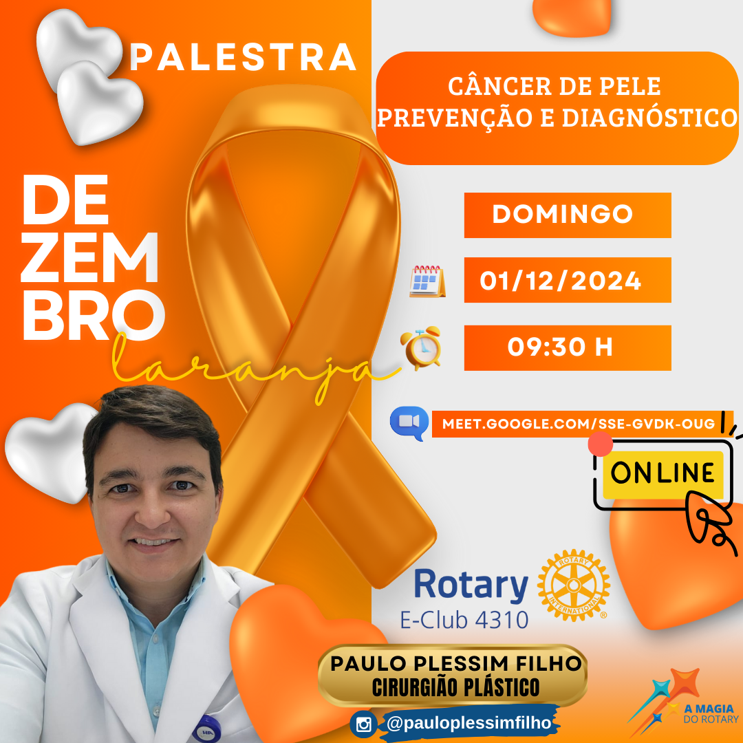 Por isso, o Rotary E-Club 4310 preparou uma palestra incrível com o Dr. Paulo Plessim Filho ( @pauloplessimfilho ) , cirurgião plástico, para ajudar você a entender tudo sobre prevenção e diagnóstico do câncer de pele.