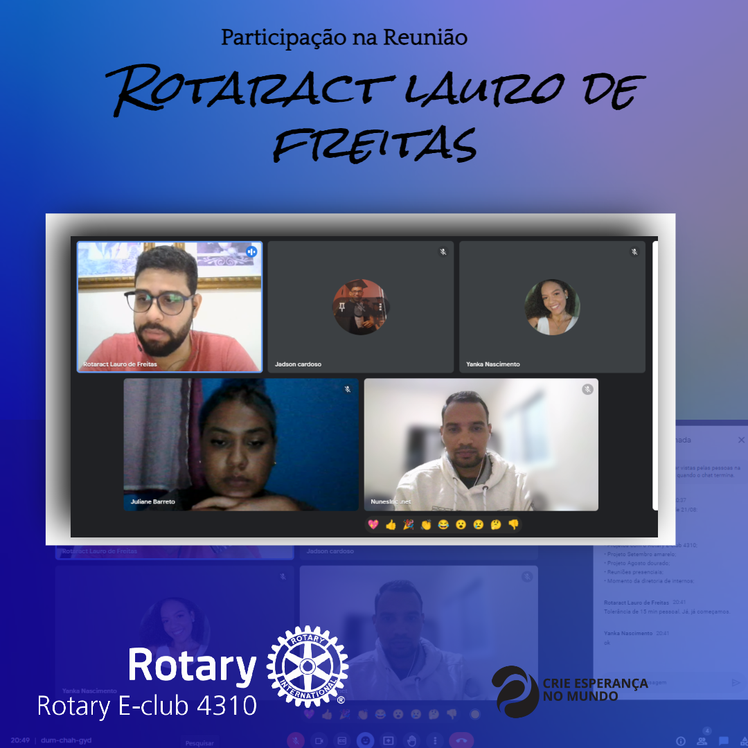 O Rotary E-Club 4310 marcou presença na Reunião do dia 21 de Agosto de 2023 do Rotaract Club Lauro de Freitas, com a presença do Presidente Nunes. Excelente reunião, associados bem engajados, com muitos projetos. Parabéns a todos os envolvidos!